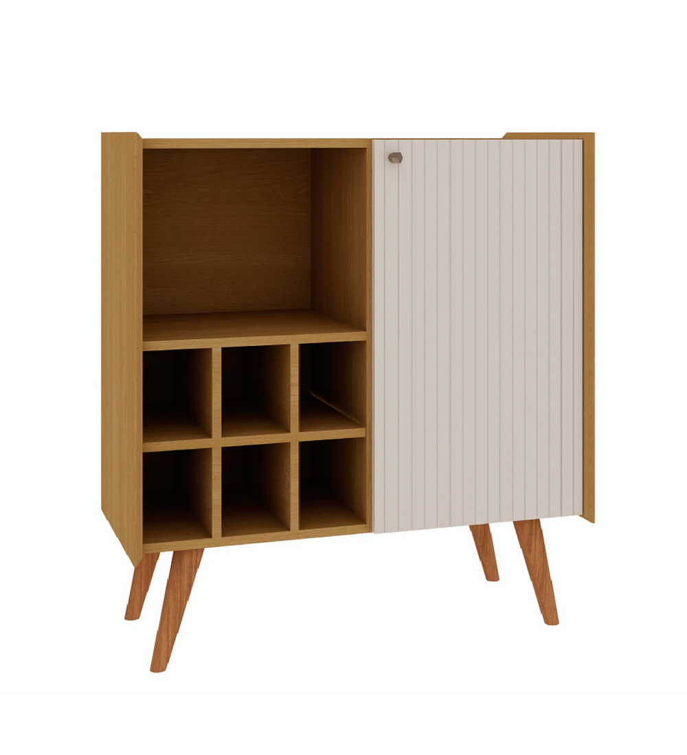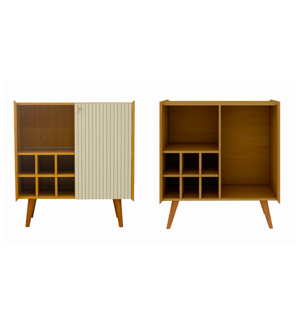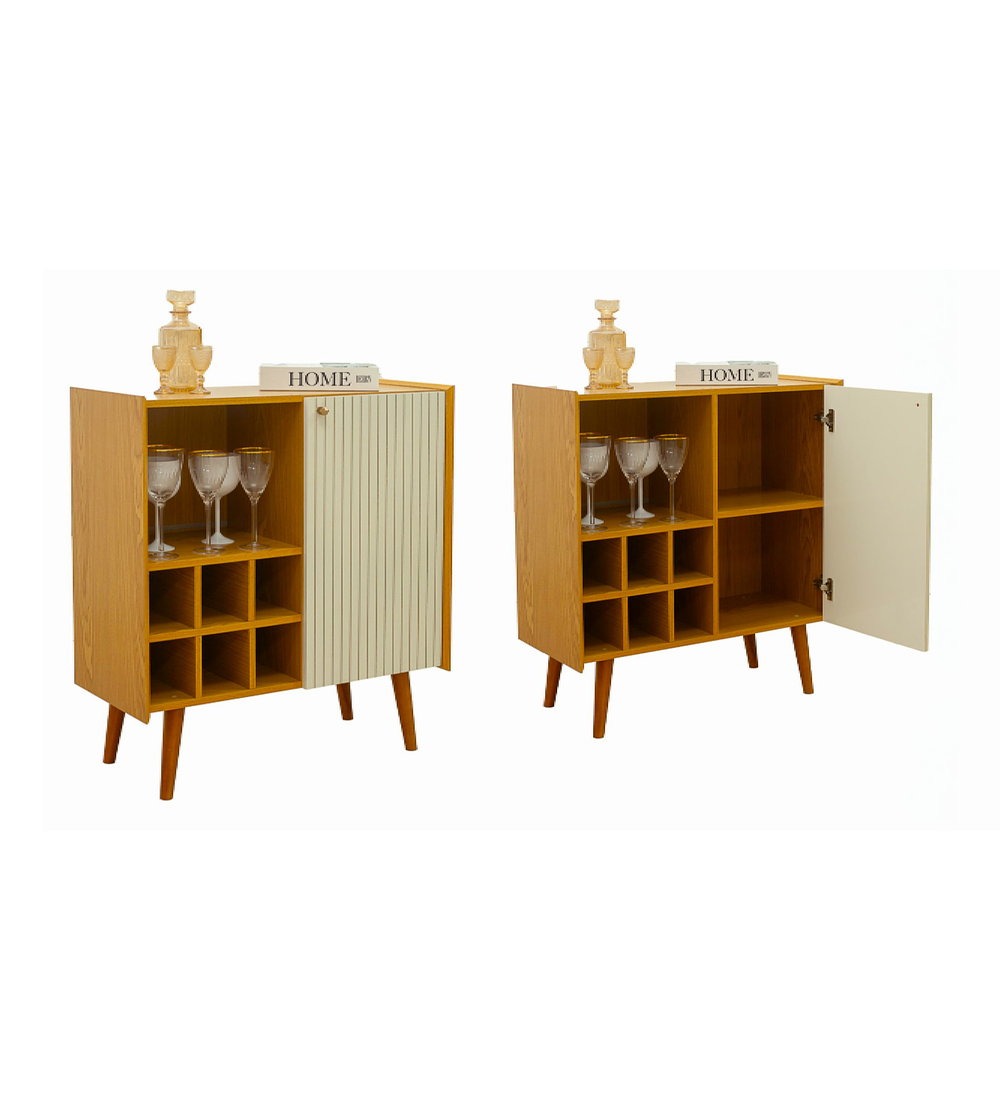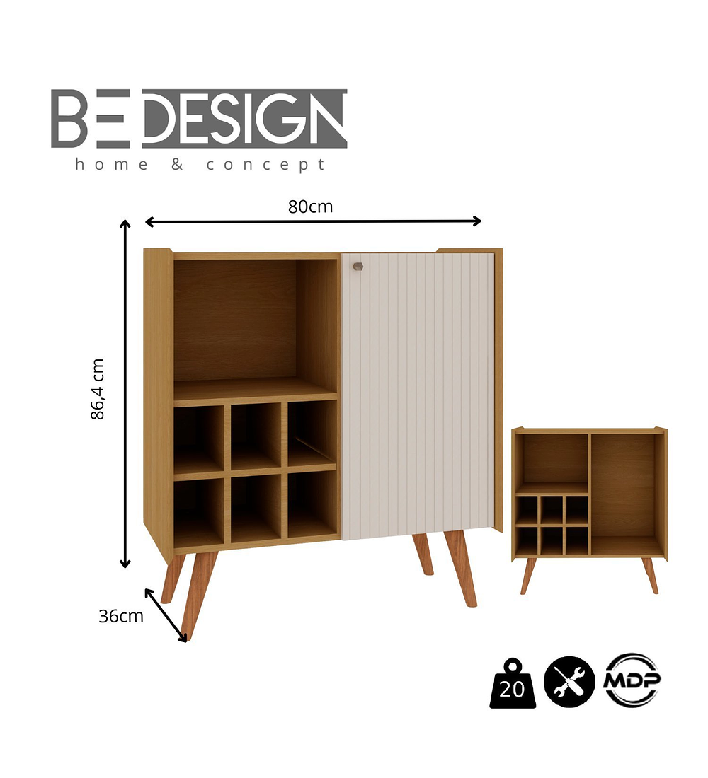 Diseñado en MDP con 4 patas altas estilo retro, cuenta con un gran espacio interior bajo la única puerta incluida, 6 espacios para almacenar botellas y 1 repisa para vasos, copas u otros objetos.