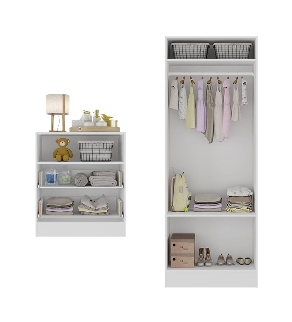 Kidscool presenta el novedoso y funcional dúo Top Baby. Un set compuesto por 2 muebles básicos en la habitación del bebé. Un closet y una cómoda. Elementos muy importantes para brindar un espacio acogedor y cómodo tanto para el pequeño como para sus padres. Cada mueble se arma por separado, por lo que pueden ser organizados en la habitación como prefieran. El closet cuenta con gran espacio interior. Lo que permitirá disponer de mayor capacidad de almacenamiento, orden y organización. En su interior tiene dos niveles e incluye una barra colgador. Cuenta con dos puertas y una repisa superior a la vista. La cómoda incluye dos cajones y una repisa a la vista. Ideal para organizar y guardar aquellas cosas que se necesita dejar a mano. Un dúo de diseño delicado y clásico, armado en MDP que permite vestir y realzar los espacios con armonía y comodidad, sin duda el set Top Baby brindara eficiencia en la organización y decoración de la habitación infantil.