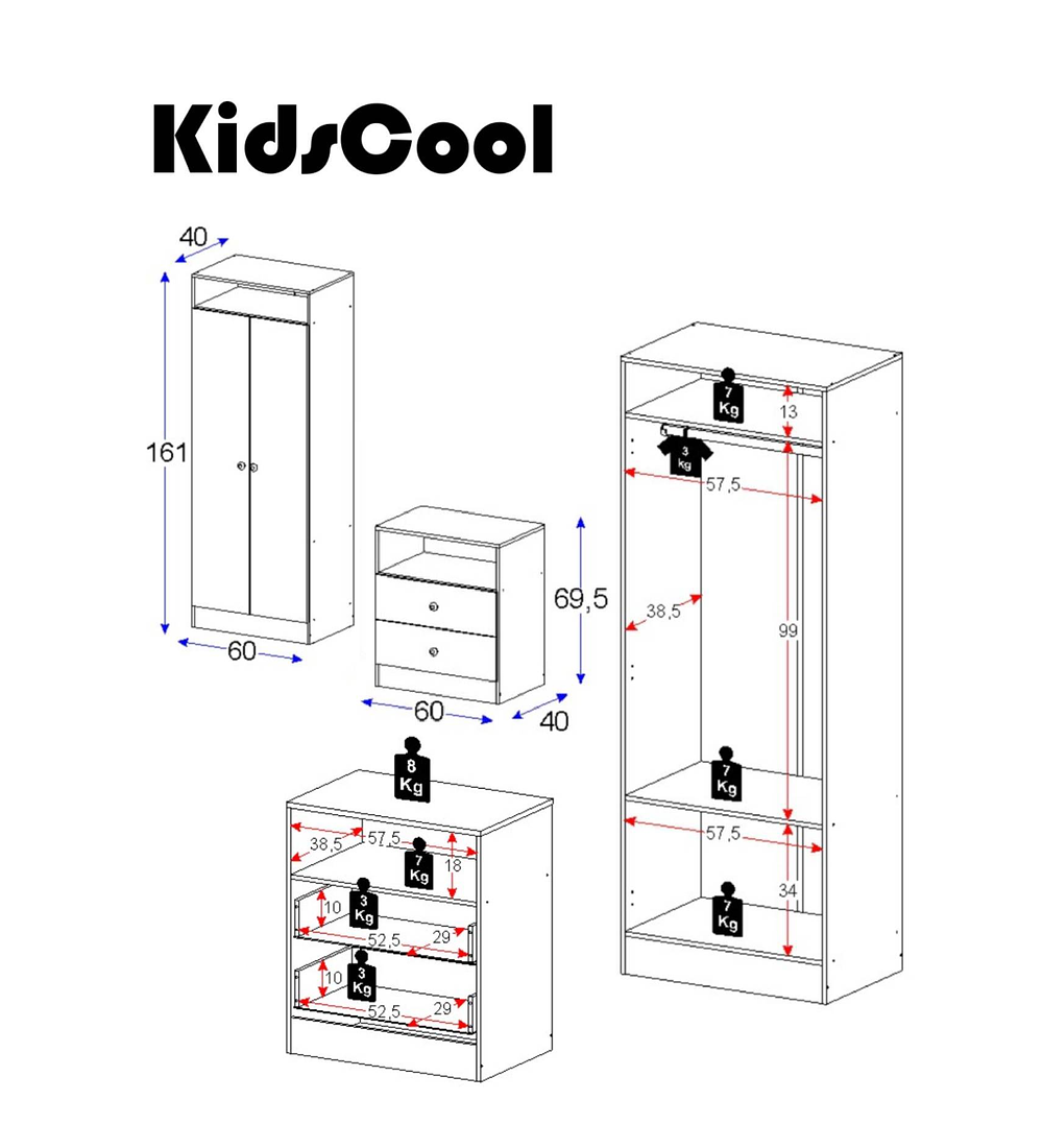 Peso máximo recomendado distribuido: Closet 23 kg Cómoda 21 kg
