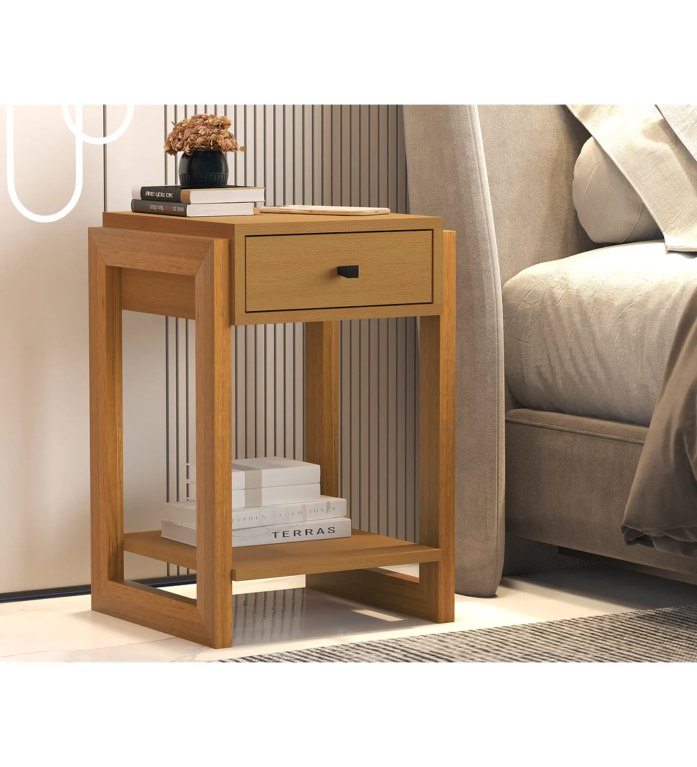 Un velador es una mesa auxiliar que sirve para apoyar lámparas, libros u otros objetos que necesitemos tener a mano cuando descansamos. Su tamaño y utilidad los hace muy comunes en el dormitorio. También pueden ser usados como apoyo en otras zonas de la casa o en cualquier rincón u otros espacios poco útiles como los situados entre dos sillones, junto a una estantería, etc. El velador Luxor de Be Design es un complemento ideal para apoyar a la decoración en cualquier habitación. Tiene un diseño simple, acogedor y moderno que lo convierte en un mueble muy fácil de combinar y de adaptar a cualquier estilo de decoración. Elaborado en MDP, incluye un cajón y una repisa a la vista. Cuenta con patas estilo laterales tipo geométrico y soporta hasta 10 kg de peso.