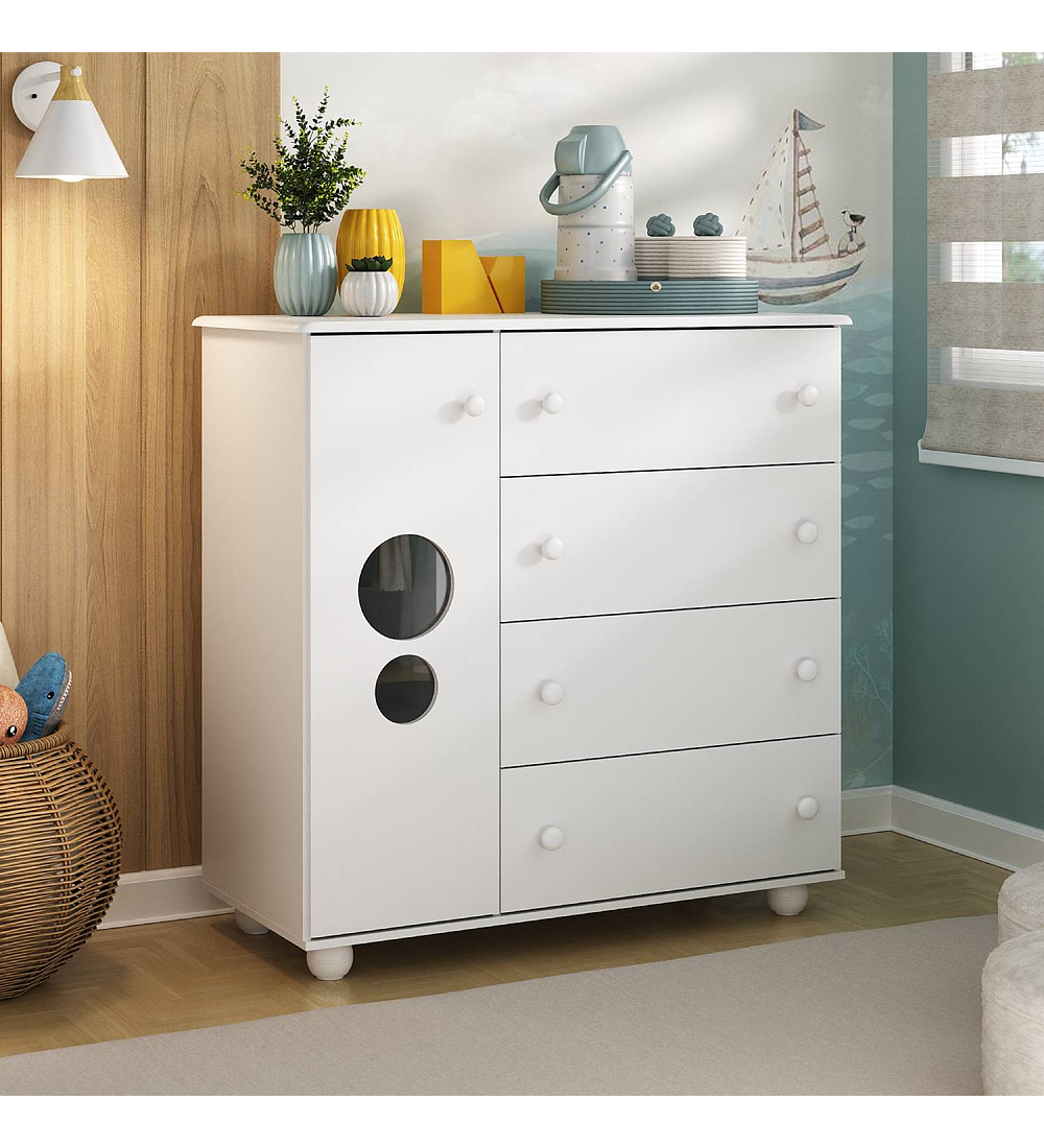 La cómoda es un elemento imprescindible en el dormitorio, ya que permite organizar y decorar los espacios. La nueva cómoda infantil Top Baby de Kidscool será una excelente opción para organizar con eficiencia la habitación de los niños, ya que además de aportar estilo con su delicado diseño, proporcionara gran espacio de almacenaje. Diseñada en MDP con suaves líneas y unas bellas y llamativas patas esféricas. Cuenta con 4 amplios cajones y un espacio lateral independiente, distribuido en 2 niveles, incluye barra colgador y puerta calada con vidrio. Un mueble fundamental para lograr una habitación acogedora y funcional. Sin duda la cómoda Top Baby dará el toque perfecto para brindar elegancia y modernidad, ya que puede complementar fácilmente con cualquier tipo de decoración sumando en estilo y eficiencia. Muy atractiva, versátil y moderna.