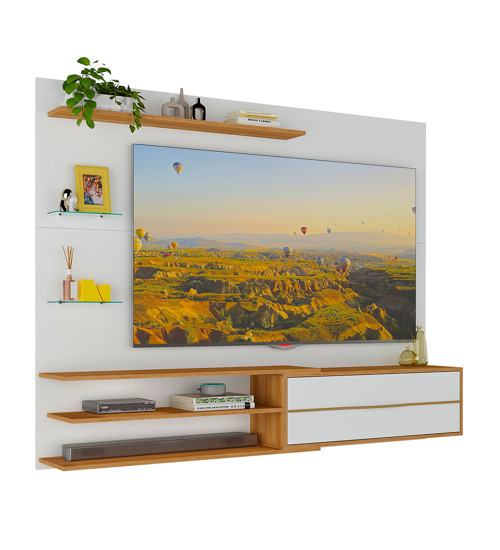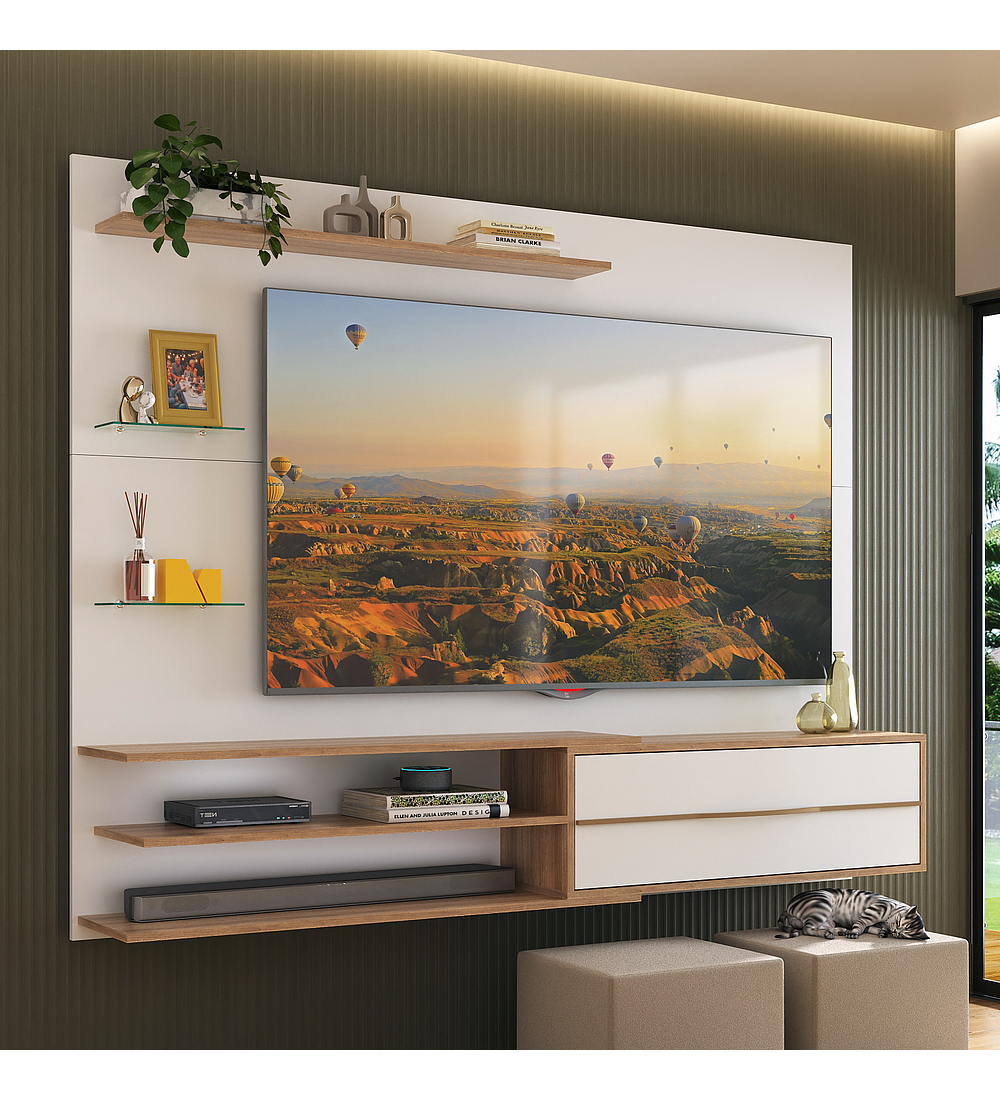 Fabricado en MDP, este panel tiene un acabado satinado, para un toque sofisticado. Con una puerta basculante y 5 estantes, dos de ellos de vidrio resistente que soportan hasta 1 kg, tiene espacio para organizar dispositivos electrónicos y objetos decorativos. El tirador alargado de polipropileno añade un toque moderno al diseño del mueble. Además, el panel para TV de 65" soporta hasta 30 kg y cuenta con un calado para el paso de cables, manteniendo el espacio libre de cables. Práctico y moderno, para una sala de estar cómoda y organizada.