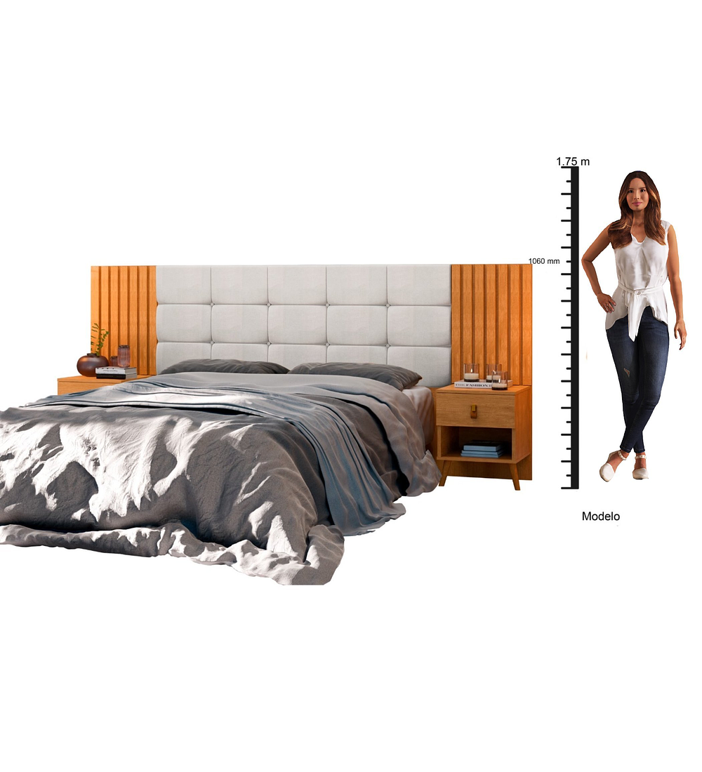 Diseñado con doble perforación, lo que permite montar con una distancia de 1,40 cm o 1,50 cm entre los veladores, o bien a una distancia de 1,60 cm. Incluye dos veladores integrados con un cajón y patas estilo retro. El respaldo está armado en MDF, en la zona de la cabecera está revestido y tapizado con tela de terciopelo acolchada, logrando un look imponente y elegante. Un mueble que vestirá con eficiencia e inteligencia la habitación, mejorando la experiencia del descanso y añadiendo personalidad al dormitorio.