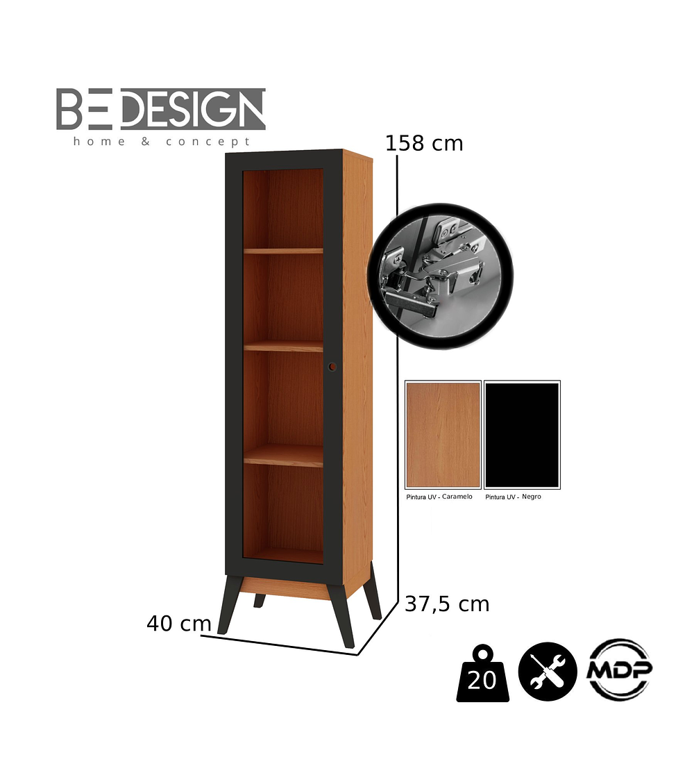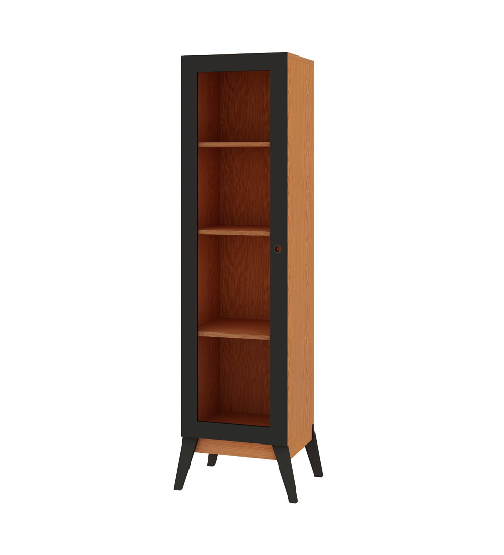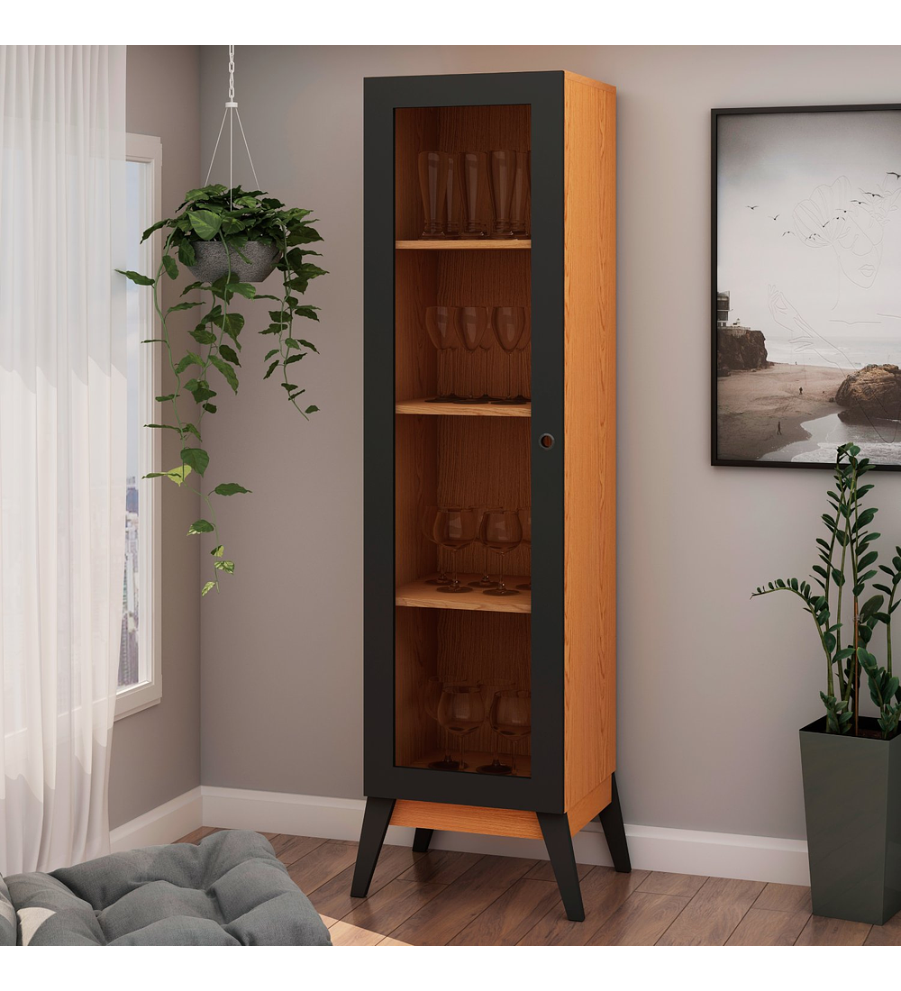 Un mueble sofisticado, atractivo y muy cómodo. Perfecto para mantener objetos delicados resguardados, y además para exhibir y mantener a la vista elementos decorativos. Elaborado en MDP de 15 mm, la vitrina Amber cuenta con 1 puerta de vidrio, patas estilo retro y 4 estantes internos con acabado UV para mayor resistencia. Un mueble versátil y muy práctico, que además de brindar una decoración única, será muy cómodo y funcional para el uso diario.